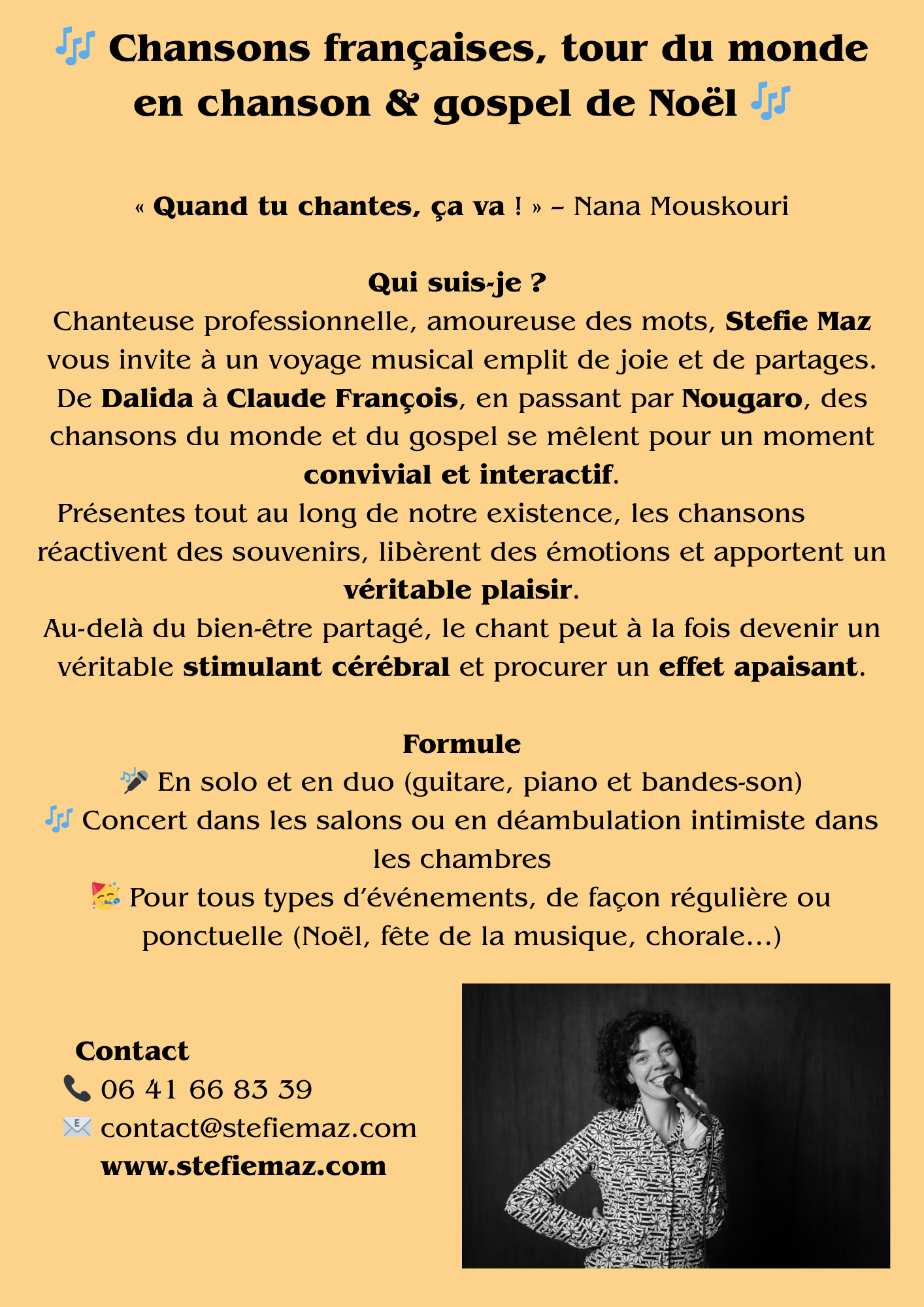 Pour les séniors, je propose des ateliers « Chanter dans la joie » ainsi qu’un « Tour de chant à tous les étages »